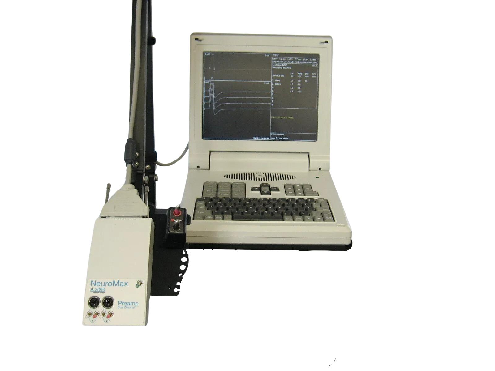 This NeuroMax 1002 CE has a durable white casing, a high-resolution 12' flat panel display, a standard laptop keyboard, and 4 USB drives for archiving patient data.